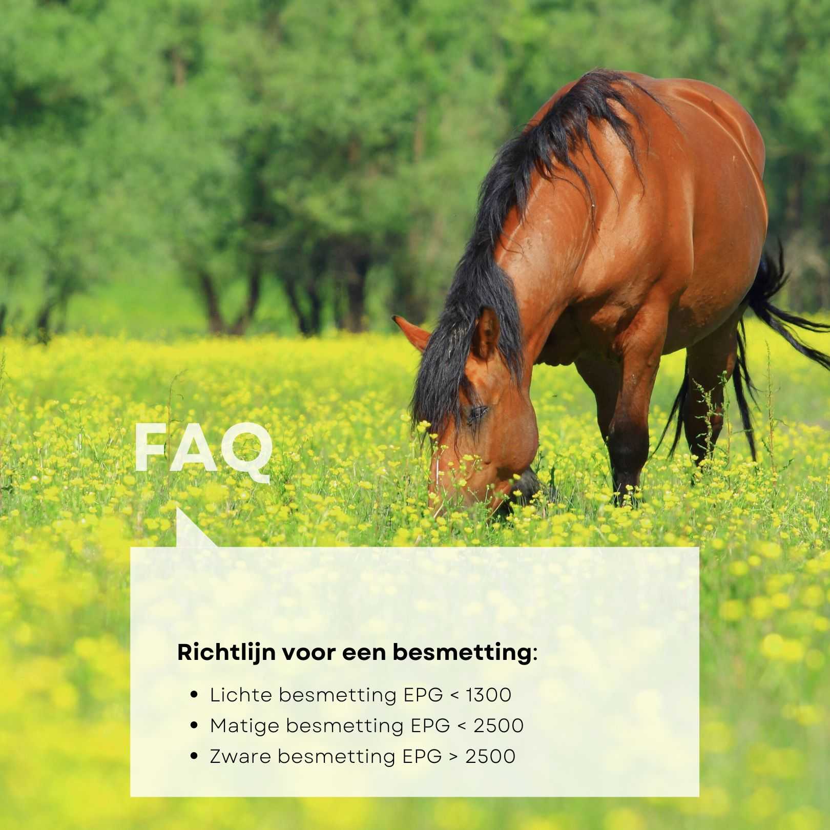 A manure test alone does not determine whether a horse needs treatment. The questionnaire, the horse’s health and age, seasonal parasite pressure, and existing records all help decide if treatment is necessary. Manure testing is custom work, which is why we always recommend filling out the questionnaire—even if your horse tests negative or only slightly positive.