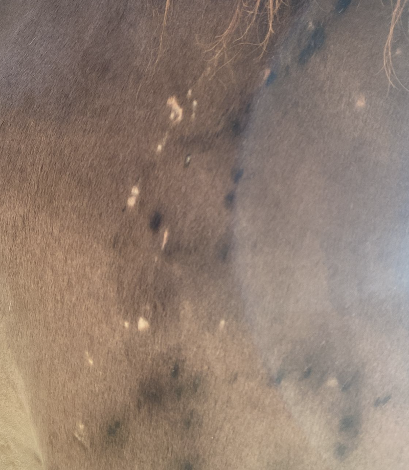 Nous sommes les heureux propriétaires de notre hongre lusitanien, Zartouche. L’été dernier, en 2023, nous avons remarqué pour la première fois qu’il réagissait plus fortement aux mouches dans le pré, ce que nous n’avions jamais constaté auparavant. Après l’été, il a développé de fortes démangeaisons et des bosses sur l’épaule droite, accompagnées de zones sans poils qui se sont ouvertes. Nous avons essayé de le traiter avec des crèmes et des poudres, mais le problème ne disparaissait pas.