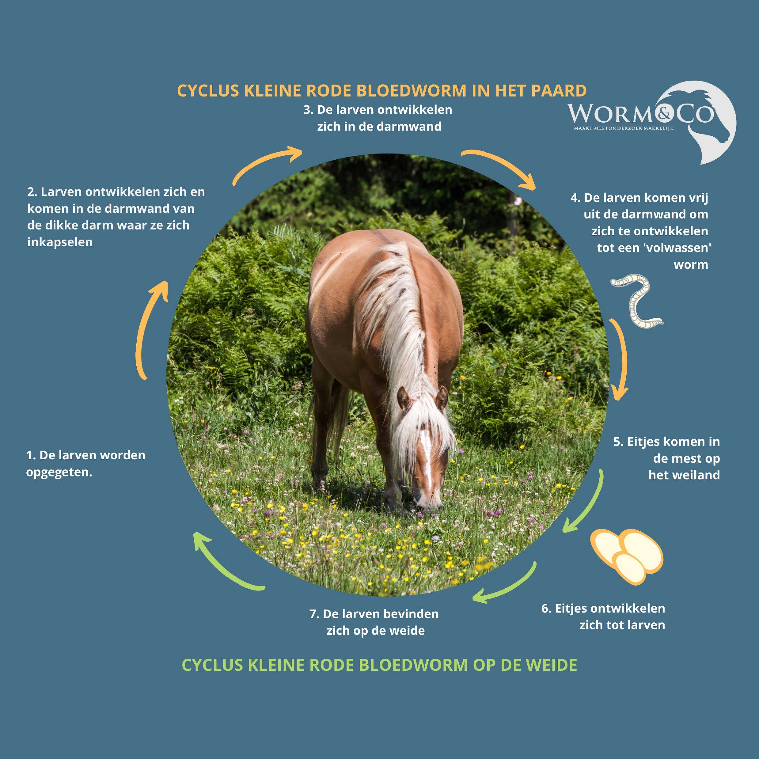 Les larves de vers (ici, les petits strongles) sont ingérées par le cheval. Une fois dans le corps, elles migrent dans la paroi intestinale où elles peuvent devenir des vers adultes, pondre des œufs et être éliminées par les crottins. Ce processus est normal et sans danger si un bon programme de vermifugation est mis en place.